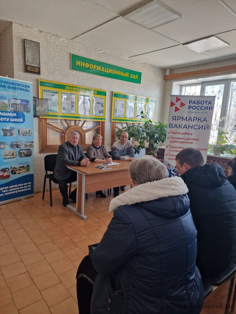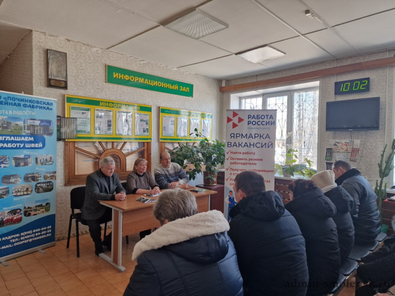 10 февраля 2026 года в Кадровом центре Ельнинского округа прошла ярмарка вакансий с участием работодателей ООО «Починковская швейная фабрика» и Ельнинского лесничества – филиала ОГКУ «Смолупрлес»