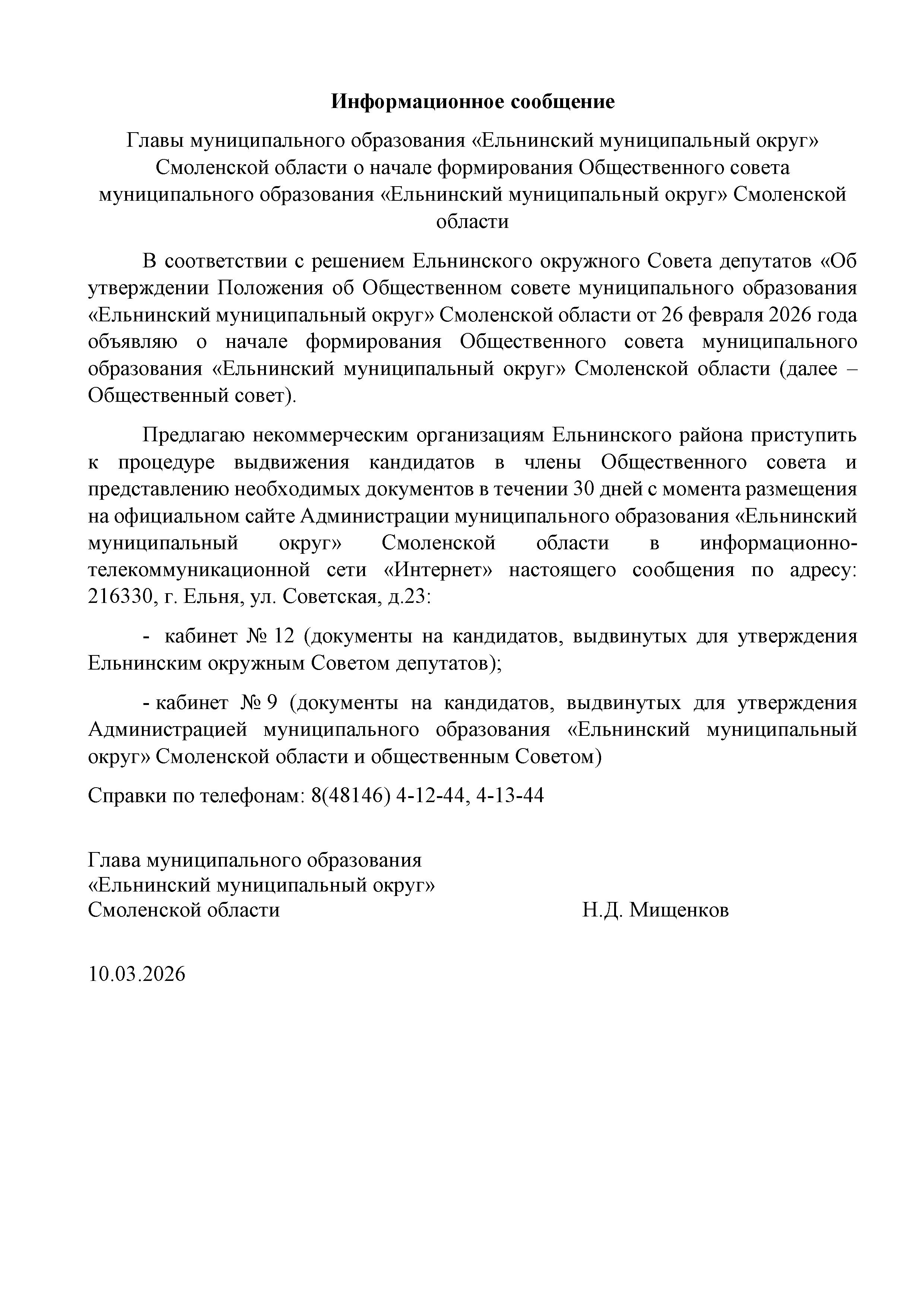 В целях снижения воздействия ледохода и паводка в 2026 году на автомобильных дорогах общего пользования регионального и межмуниципального значения Ельнинского округа Смоленской области и искусственных сооружений на них, а также предупреждения возникновения негативных последствий в случае прекращения транспортного сообщения между населенными пунктами, Администрация муниципального образования «Ельнинский муниципальный округ» Смоленской области просит Вас не совершать незаконных действий в части закрытия отверстий водопропускных труб и уборке из зон подтопления заготовленного леса.