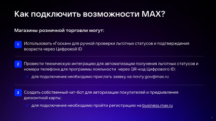 - Быстрая интеграция с кассовым оборудованием и приложением MAX;