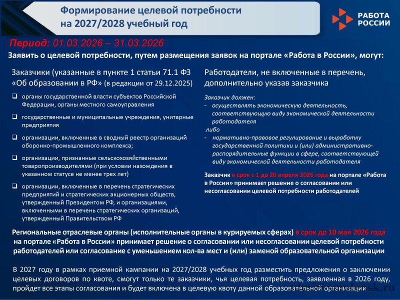 с 1 по 31 марта 2026 года на Единой цифровой платформе в сфере занятости и трудовых отношений «Работа в России» проводится кампания по подаче предложений о целевой кадровой потребности