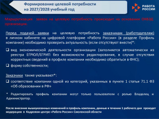 Для подачи заявок о целевой кадровой потребности, организациям и предприятиям необходимо указать в своем профиле на ЕЦП «Работа в России»: вид экономической деятельности, форму собственности и соответствие компании одной из категорий, указанных в статье 71.1 ФЗ «Об образовании в Российской Федерации».